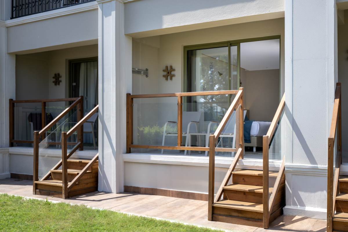 Deluxe Terrace Room with Garden View; there are 24 in total. It is 33 m² in width, consisting of 1 Bedroom, there are 2 double beds or 2 single beds. It is suitable for a maximum of 2+2 or 3+1 stays.