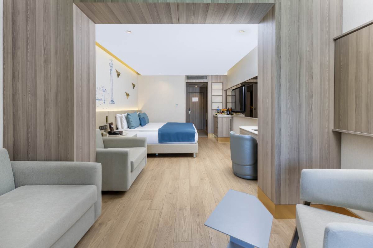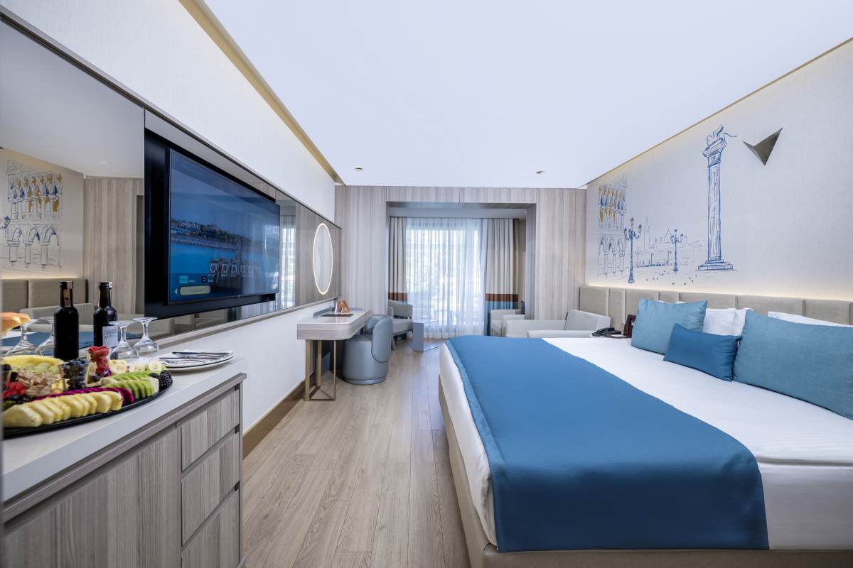 Swim Up; there are 44 of them. It is 40 m² in width, consisting of 1 bedroom. There is 1 double bed and 2 sofas. It's suitable for a maximum of 2+2 or 3+1 accommodation.