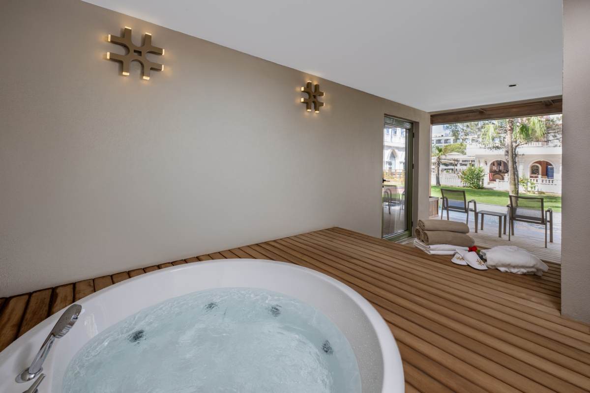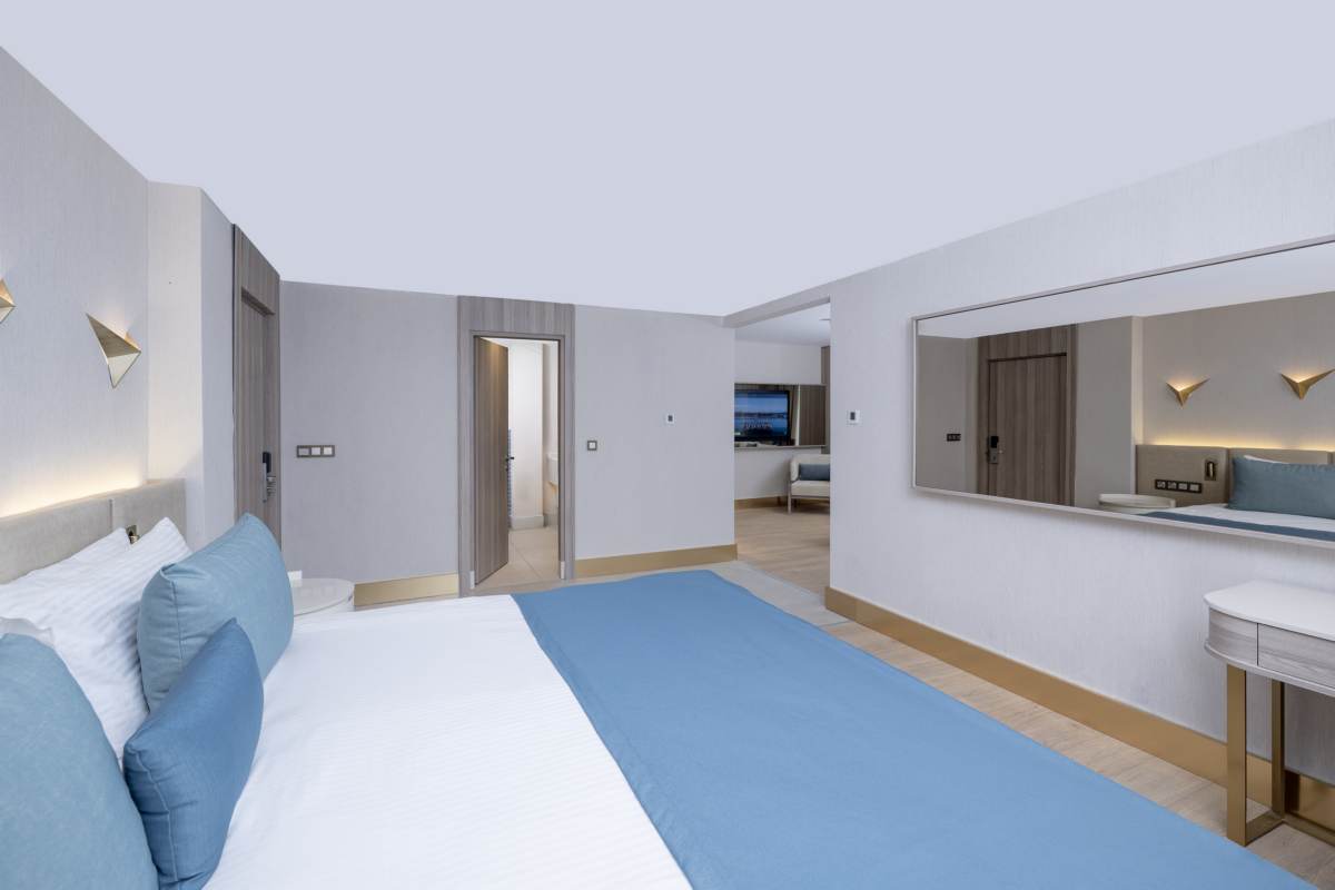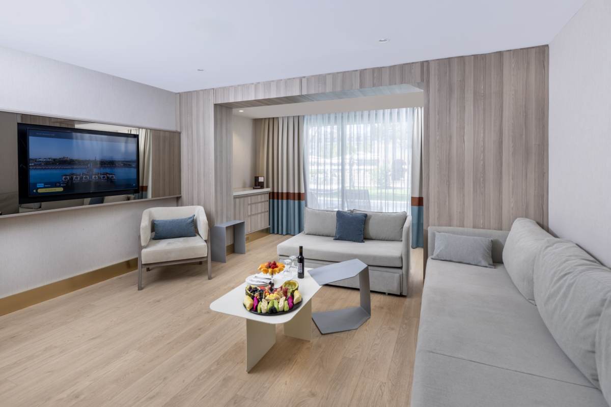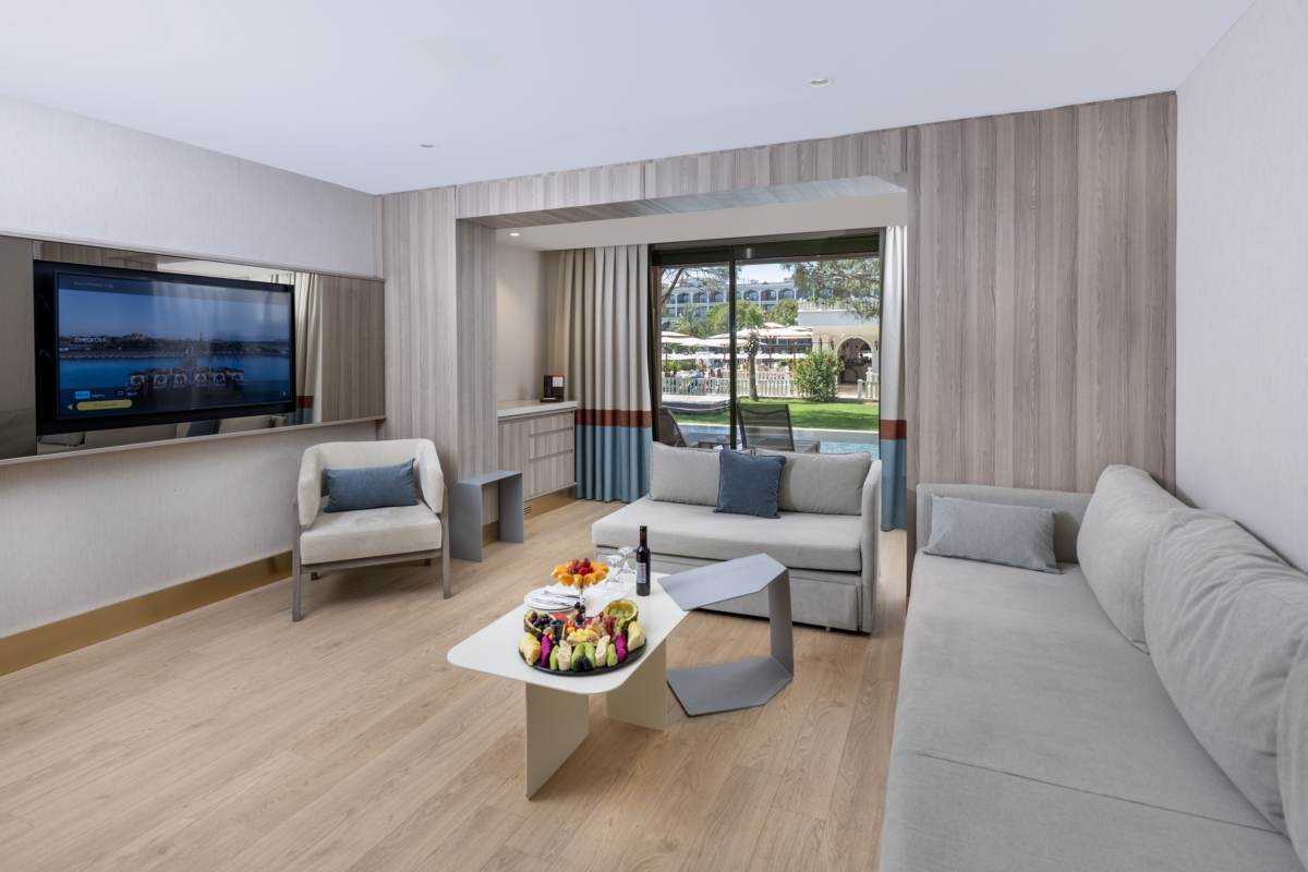 The Swim Up Suite; there are 4 of them. It is 85 m² in size, consisting of 1 bedroom and 1 living room. There is 1 double bed and 2 sofas. There is a jacuzzi on the terrace. It is suitable for a maximum of 2+2 or 3+1 accommodation.