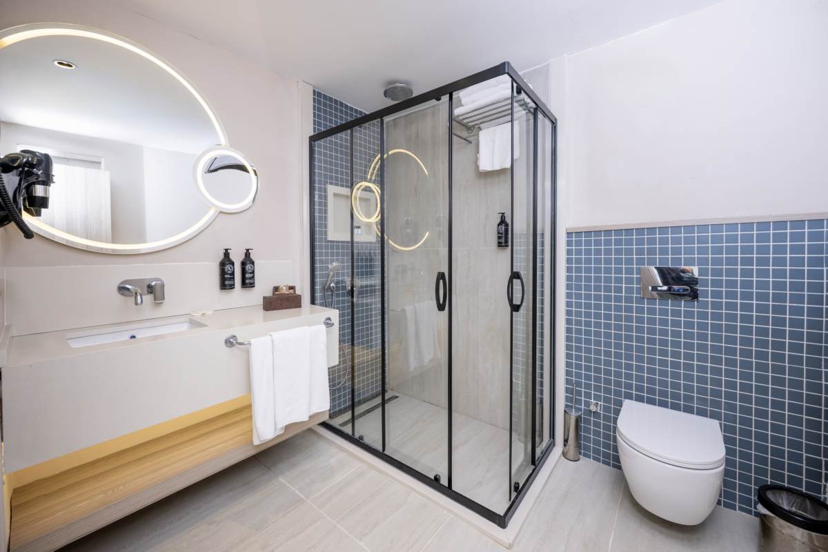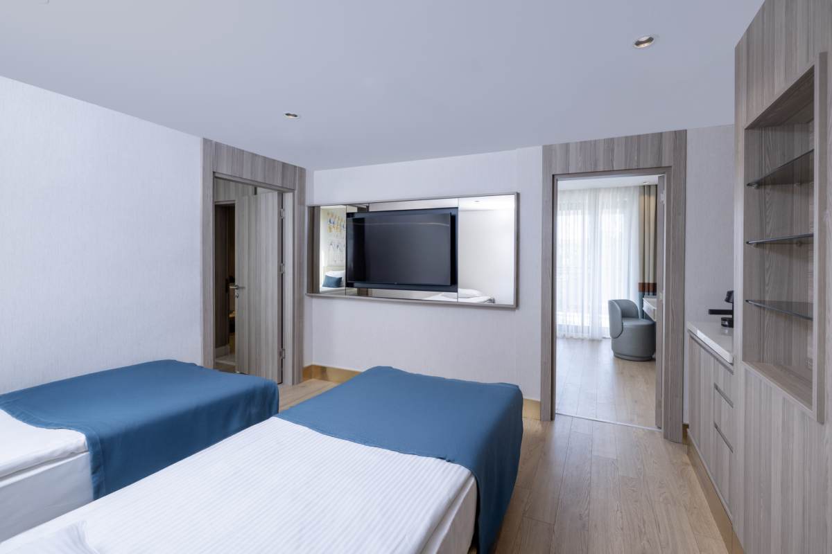 Corner Suite; there are 31 of them. It is 60 m² wide, consists of 2 bedrooms and 1 living room. There is 1 double bed, 2 single beds and 1 sofa. 4 Adults + 1 Child (0-11.99 Years Old)