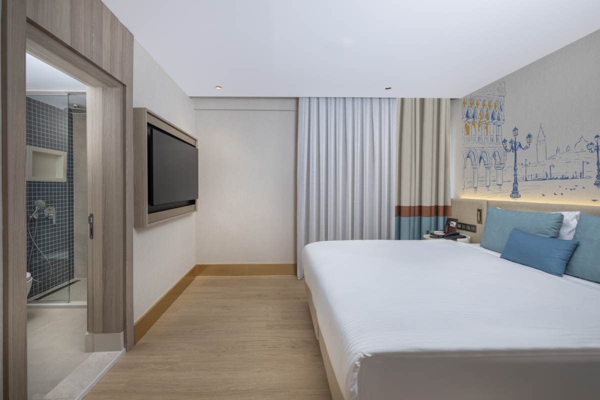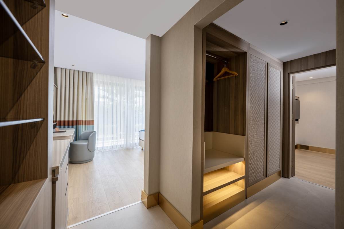 The Garden View Family Suite; there are 4 of them. It is 60m² in width, consisting of 2 bedrooms. There is 1 double bed and 2 single beds. There is a Jacuzzi on the terrace. Suitable for a maximum of 4 adults +1 baby stay.