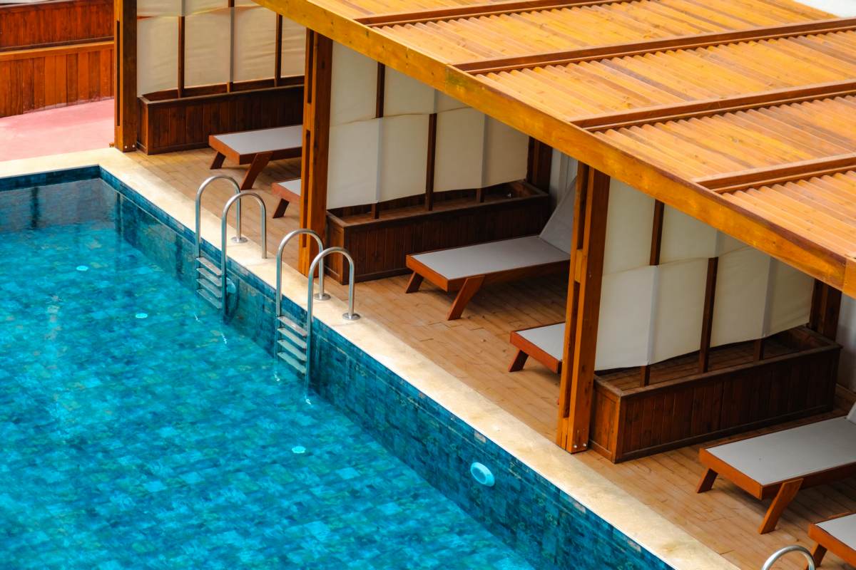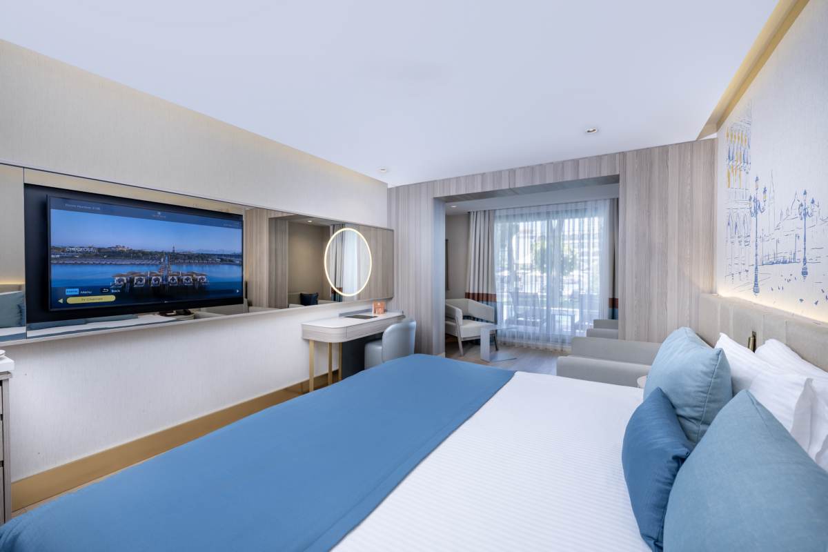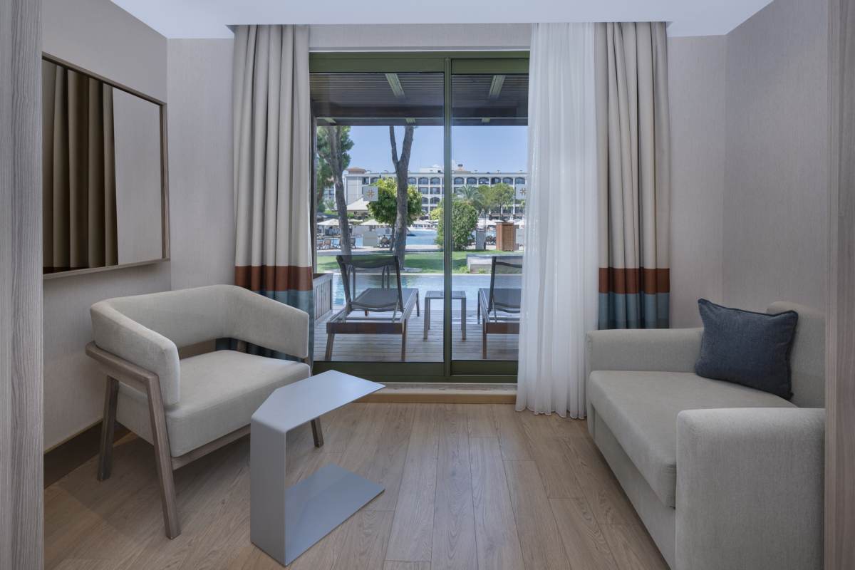 Swim Up; there are 44 of them. It is 40 m² in width, consisting of 1 bedroom. There is 1 double bed and 2 sofas. It's suitable for a maximum of 2+2 or 3+1 accommodation.