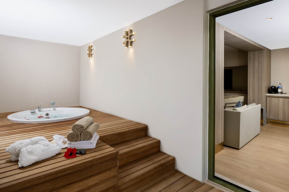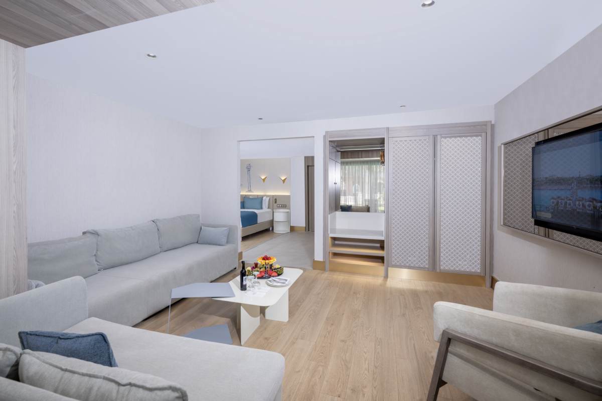 The Swim Up Suite; there are 4 of them. It is 85 m² in size, consisting of 1 bedroom and 1 living room. There is 1 double bed and 2 sofas. There is a jacuzzi on the terrace. It is suitable for a maximum of 2+2 or 3+1 accommodation.